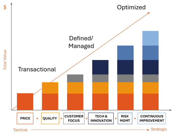 We help you evolve your procurement strategy through our proven Maturity Model, guiding spend categories from tactical to strategic where it matters most by evaluating how factors such as price, quality, and risk contribute to total value.